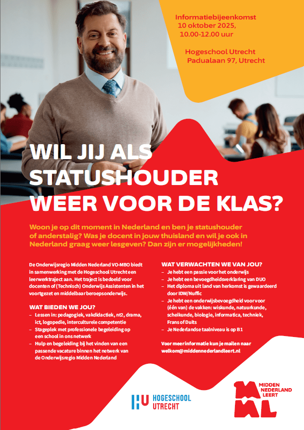 Woon je op dit moment in Nederland en ben je statushouder of anderstalig? Was je docent in jouw thuisland en wil je ook in Nederland graag weer lesgeven? Dan zijn er mogelijkheden! Kom naar de informatiebijeenkomst Status voor de Klas