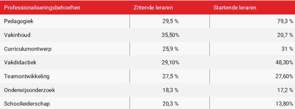 De top 3 van ontwikkelingsbehoefte bestaat uit pedagogiek, vakinhoud en vakdidactiek. Er zijn echter duidelijke verschillen te zien tussen de behoeften van startende leraren en leraren die al langer bezig zijn (zie tabel). Zo wil meer dan driekwart van de startende leraren zich verder ontwikkelen op het gebied van pedagogiek, terwijl nog geen derde van de zittende leraren daar behoefte aan heeft. Teamontwikkeling daarentegen wordt door beide groepen even belangrijk gevonden.